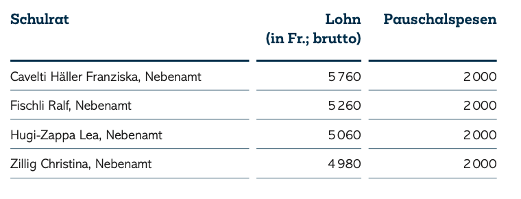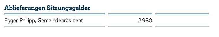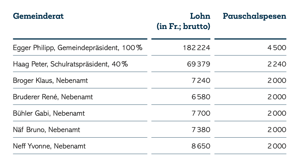 Gemäss Gemeindegesetz sind die Behördenlöhne im Interesse der Transparenz in geeigneter Form zu veröffentlichen. Haupt- oder teilzeitamtliche Behördenmitglieder erhalten keine Sitzungsgelder der Gemeinde und liefern zudem Sitzungsgelder an die Gemeinde ab, die sie für Tätigkeiten im Auftrag der Gemeinde in externen Gremien und Kommissionen erhalten. Die Zahlen für das Jahr 2024 lauten: