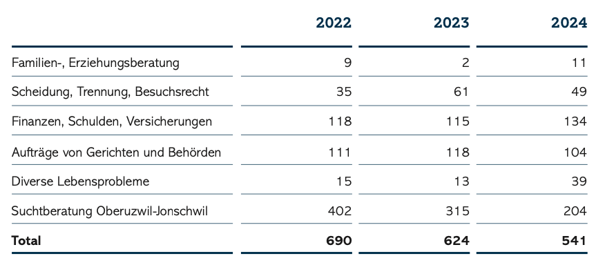 In der rechtsstehenden Tabelle findet sich ein Überblick über die Themeninhalte der Beratungsgespräche der Sozialen Dienste im Jahr 2024. Auch im vergangenen Jahr lag der Schwerpunkt in den Beratungen beim Thema «Finanzen». Beratungen rund um das Thema Finanzen/ Schulden beinhalten verschiedenste Themenfelder, da ein geringes Einkommen oder Arbeitslosigkeit Auswirkungen auf viele Lebensbereiche haben (soziale Teilhabe, Gesundheit, Beziehungen etc.). Die Scham über die eigenen Finanzen zu sprechen, ist nach wie vor sehr hoch. Die Sozialberatung unterstützt in solchen Situationen ratsuchende Personen und es wird gemeinsam eruiert, ob allenfalls ein Sozialversicherungsanspruch besteht oder ob beispielsweise eine Stiftung einen Betrag übernehmen könnte. Es wird zudem versucht, ein Budget zu erstellen, welches dauerhaft umsetzbar ist.